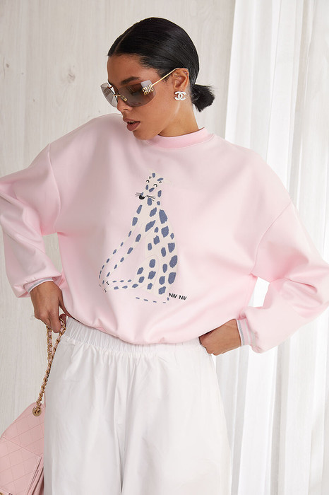 Свитшот из плотного премиального трикотажного полотна (интерлок). Изделие прямое. Горловина круглая с притачной планкой из отделочной ткани. Рукав спущенный, длинный, объемный. Низ рукава на манжете из отделочной ткани. Низ изделия на планке из отделочной ткани. Перед и спинка изделия прямые. На передней половинке свитшота авторская печать.