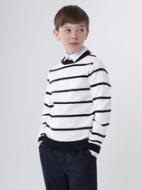Джемпер-обманка для мальчика из трикотажного полотна и текстиля с длинными втачными рукавами на манжете. Джемпер прямого силуэта, горловина V-образная с отложным воротником на стойке из текстиля.