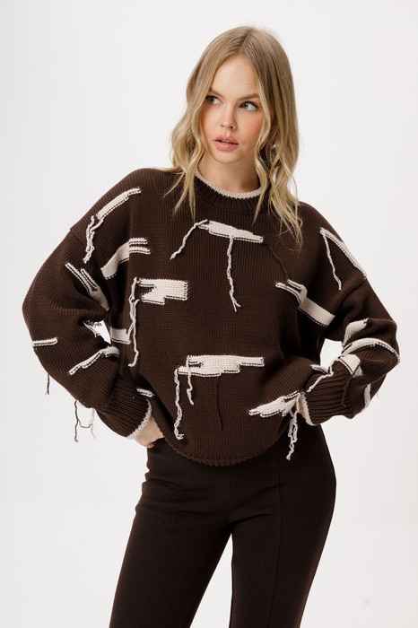 Вязаный свободный джемпер из хлопковой пряжи с декоративными элементами.