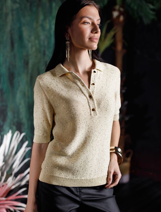 Состав: 90%Хлопок 10%ПЭ Плотность: 5 GGЛегкий джемпер поло бежевого цвета с коротким руковом выполнен из хлопковой пряжи с вкраплением сияющих пайеток, что придает особую изысканность. Стильный джемпер связан изнанкой, пряжа отличается легкостью и приятной текстурой, совершенно не колется, обеспечивает комфорт даже при длительном использовании, а натуральные волокна поддерживают оптимальный температурный баланс. Крой полуприлегающий, подчеркивает женственный силуэт, а отложной воротничок с застежкой на золотистые пуговицы и манжеты на рукавах гармонично завершают дизайн, создающий аккуратный образ. Нарядный джемпер подойдет девушкам и женщинам больших размеров, в нем вы будете чувствовать себя уверенно и свободно в любой ситуации. Мерцающий эффект пайеток добавляет образу выразительности и индивудуальности. Сочетайте джемпер в романтическом образе с пышной юбкой, в более строгом с широкими брюками. С этим поло легко создать премиальный лук в стиле old money. Мерцающее полотно добавляет особого шарма вашему образу, делая его уместным как на праздник, так и для повседневного выхода. Новый год, вечеринка или любое другое мероприятие пройдут ярко — сияющие пайетки создают ощущение праздника в каждом движении.