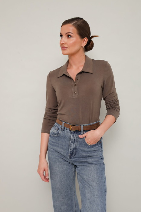 Трикотажное поло с отложным воротником с цельнокроеной стойкой. Вырез горловины обработан притачными планками с застежкой на петли и пуговицы. Втачные длинные рукава.