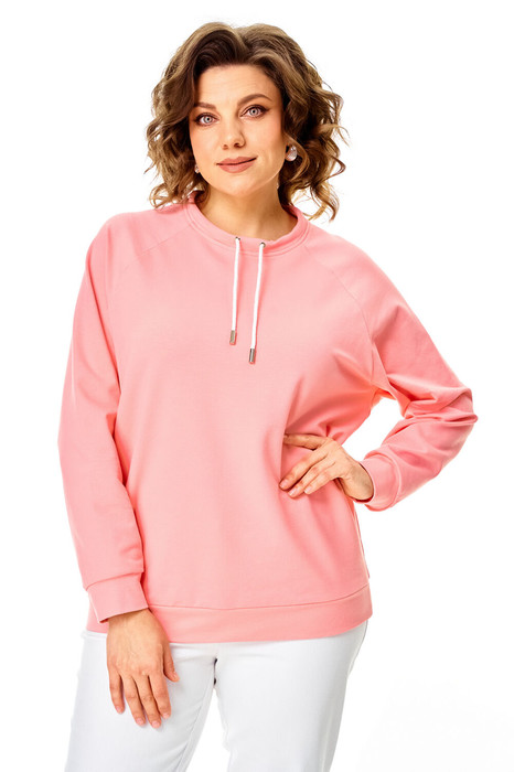Джемпер женский из трикотажной хлопковой ткани (двунитка). Рукав реглан. Низ рукава обработан притачной манжетой. Низ изделия оформлен притачным поясом. На спинке настрочен декоративный элемент. Вырез горловины круглый, обработан бейкой со шнуром.