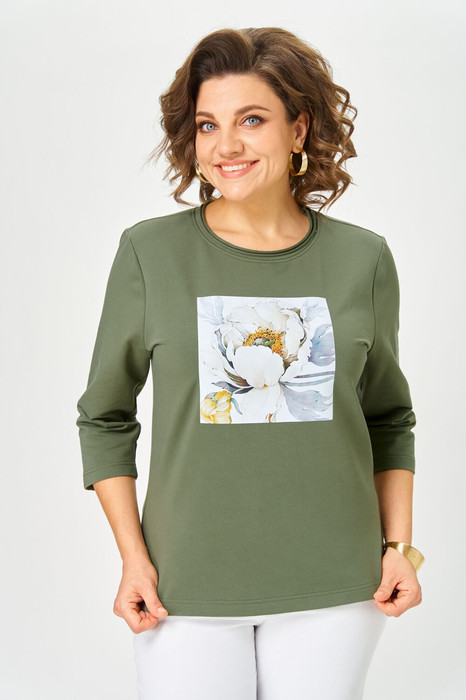 Джемпер женский из трикотажной хлопковой ткани (двунитка). По переду расположен принт.  Рукав втачной 3/4, прямой.  Вырез горловины круглый, оформлен бейкой с необработанными краями.