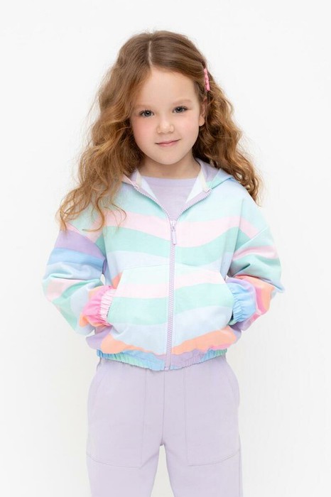 Трикотажная толстовка с капюшоном для девочки из мягкого набивного футера петли. Модель застёгивается на молнию, спереди два кармана. Пояс и манжеты на резинке.