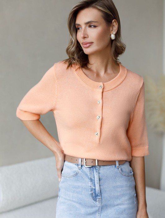 Состав: 70%Хлопок 21%ПА 9%Кашемир Размер товара на первом фото: 42Джемпер тонкой вязки выполнен из хлопка с добавлением кашемира. Модель с круглым вырезом дополнена золотистыми пуговицами. Мягкая и очень приятная пряжа совершенно не колется, сохраняет тепло при этом не перегревая, гарантируя безупречный комфорт.
