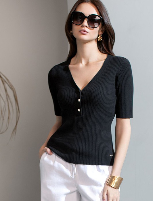 Состав: 83%Вис 17%ПА Плотность: 12 GG Параметры модели на первом фото: Рост 172, бюст 88, талия 64, бедра 88 Размер товара на первом фото: 42Джемпер тонкой вязки из вискозы с нейлоном. Модель с V- вырезом прилегающего силуэта дополнена золотистыми пуговицами. Мягкая очень приятная к коже пряжа хорошо держит форму и гарантирует комфорт во время носки в течение всего дня. Изделие дополнено фирменным металлическим логотипом бренда.