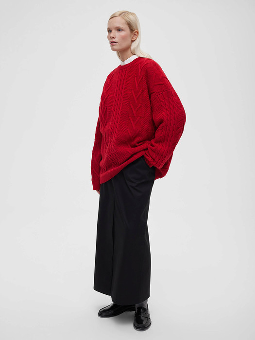 Джемпер женский свободного кроя с круглым вырезом и фактурным плетением косами, цвет – бордовый.