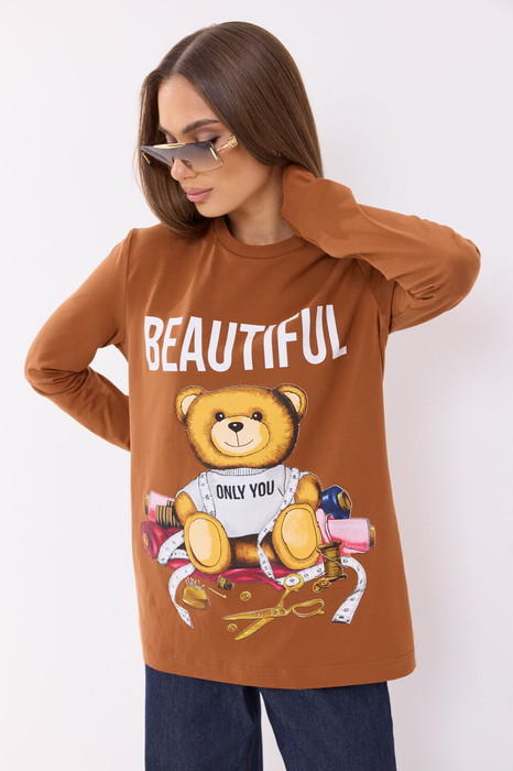Джемпер прямого силуэта из трикотажного полотна. Горловина круглой формы. Рукав прямой удлинённый с отверстием для большого пальца. На переде выполнена печать.