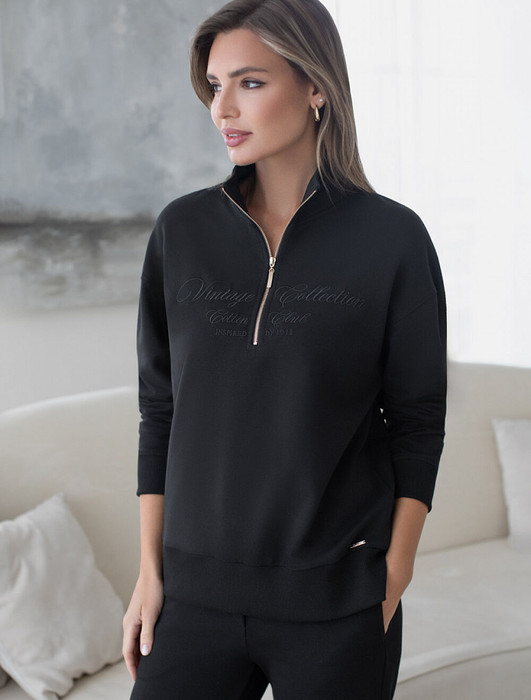 Уютный и комфортный вариант для прохладной погоды – стильный джемпер черного цвета с воротом на молнии. Изготовлен из премиального футера трехнитки с добавлением эластана. Материал сохраняет форму при длительном ношении и после многократных стирок, его мягкая текстура дарит ощущение уюта и тепла. Минималистичная вышивка в тон изделия в виде надписи. еревод надписи: Vinlage collection cotton club - Винтажная коллекция Хлопковый клуб. Свободный крой джемпера позволяет не ограничивать движения, что особенно важно для активного образа жизни. Подойдет на любую женскую фигуру, представлена широкая размерная линейка, большие размеры, легко комбинируется с другими вещами, создавая модные образы в стиле спорт-шик. Этот повседневный джемпер сочетает в себе удобство и актуальность, будет универсальным выбором для отдыха или прогулок.