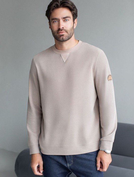 Легкий и невероятно комфортный джемпер серого цвета создан для повседневного образа. Мягкий фактурный эластичный трикотаж приятно ощущается на теле, не сковывает движения и отлично подходит для носки в любое время года. Полуприлегающий крой обеспечивает свободу и удобство, позволяя выглядеть стильно и чувствовать себя уверенно каждый день. Круглый ворот украшен декоративной нашивкой в виде перевернутого треугольника, добавляющей оригинальности.. Манжеты на рукавах и по низу аккуратно оформлены, что придает завершенность внешнему виду и способствует сохранению формы джемпера после длительной носки и многочисленных стирок. Принт в виде небольшой надписи добавляет яркости, подчеркивая индивидуальность каждого мужчины. Перевод надписи: Уour only limit is your mind - Твой единственный предел — твой разум.