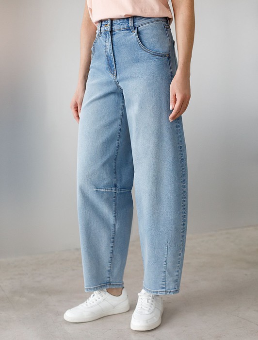— Джинсы баррель с декоративной стиркой из эластичного денима