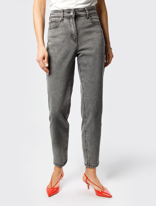 Состав: 94%Хлопок 6%ПУ Плотность: 14.5 OZ Параметры модели на первом фото: Рост 172, бюст 88, талия 64, бедра 88Джинсы mom-fit светло-серого цвета выполнены из эластичного денима. Лаконичная модель с легкой стиркой хорошо впишется в непринужденный повседневный образ с вещами и нейтральной, и яркой гаммы. Комфортная посадка на талии подходит для любой фигуры, ткань хорошо тянется и не сковывает движений. Изделие дополнено классической задней нашивкой из бежевой эко-кожи с логотипом бренда.