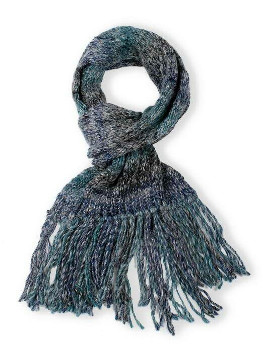 Шарф женский трикотажный одинарный, с заработанными краями, связан грубой вязкой, иммитирующей ручное вязание. основное переплетение: ажур на базе кулирной глади. шарф выполнен с бахромой.