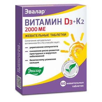 В жевательных таблетках Витамин Д 2000 МЕ + К от компании «Эвалар» натуральный витамин D с высокой дозировкой усилен натуральным витамином К в самой биодоступной форме МК-7. К дополняет действие витамина D тем и помогает ему лучше усваиваться организмом. Это единственный в России витамин D с высокой дозировкой, усиленный витамином К. А за счет удобной формы жевательных таблеток Витамин Д 2000 МЕ + К от «Эвалар» усваивается еще лучше.