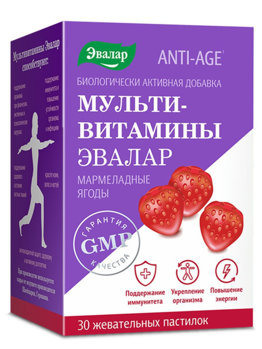Неважно, сколько вам лет: 30, 40, 50 или больше - Мультивитамины Эвалар созданы именно для вас! Состав сбалансирован с учетом ежедневной потребности вашего организма в каждом из них. Представляете, пока вы наслаждаетесь заманчивым вкусом очередной мармеладки, организм получает настоящий "чудо-коктейль" из 15 важных витаминов и минералов с антиоксидантами! А они способствуют поддержанию: хорошего самочувствия, жизненных сил и энергии при физических, умственных, психоэмоциональных нагрузках и стрессах; иммунной системы и устойчивости организма к инфекциям; здоровья костей; красоты кожи, волос и ногтей и защищают клетки от воздействия свободных радикалов.