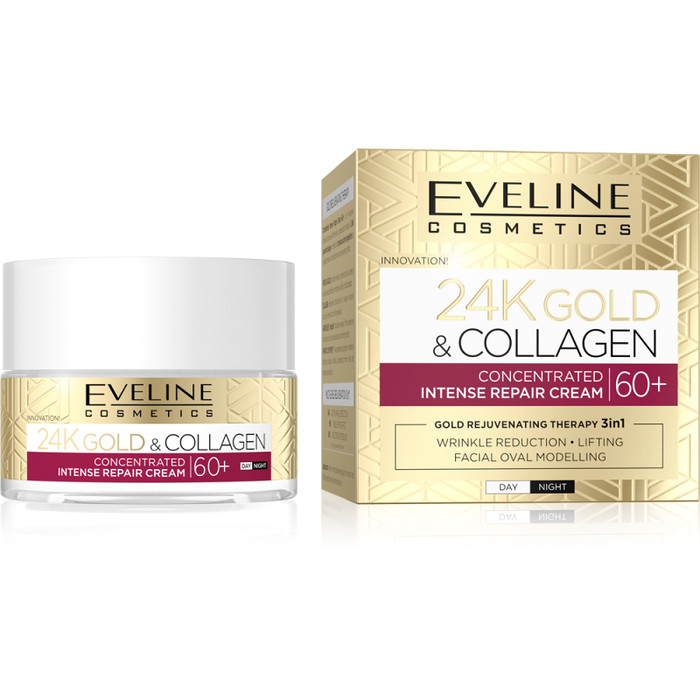 Концентрированный восстанавливающий крем 24K GOLD & COLLAGEN 60+ заметно уменьшает видимость морщин. Интенсивно стимулирует регенерацию кожи, повышает ее упругость и эластичность, а также эффективно восстанавливает сияющий вид.