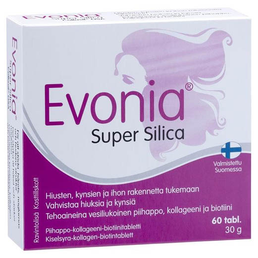 Уникальная пищевая добавка, содержащая кремний в виде водорастворимой кремниевой кислоты, гидролизованный рыбий коллаген и биотин. Эти активные ингредиенты поддерживают структуру и долговечность волос, ногтей и кожи. Дозировка: 1-3 таблетки в день. При необходимости дозировку можно увеличить до 6 таблеток в сутки. Не рекомендуется беременным и кормящим женщинам. Состав: Средство против слеживания микрокристаллическая целлюлоза, кукурузный крахмал, препарат кремниевой кислоты Collasil® Osa, содержащий кремний и гидролизованный рыбный коллаген, вещество для обработки поверхности магниевые соли жирных кислот, D-биотин. Аллергены Рыба Питательные свойства: Без глютена, менее 20 мг/1 кг Не содержит лактозы Без дрожжей Без сахара Сделано в Финляндии