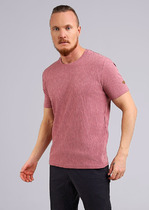 Фуфайка с коротким рукавом среднего объема, круглым вырезом горловины, которая оформлена обтачкой из рибаны, выполненная из набивного полотна.