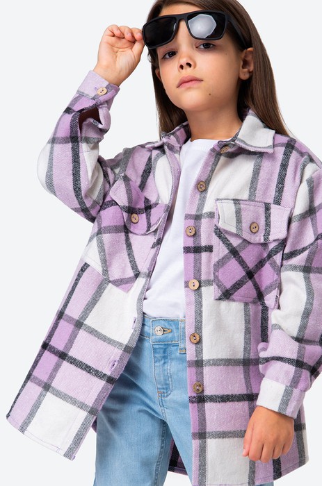 Фланелевая рубашка застегивается на акцентные роговые пуговицы. Спереди есть накладные кармашки на пуговицах с клапанами. Лиловая рубашка из фланели – идеальный выбор для активных детей, она не сковывает движений.