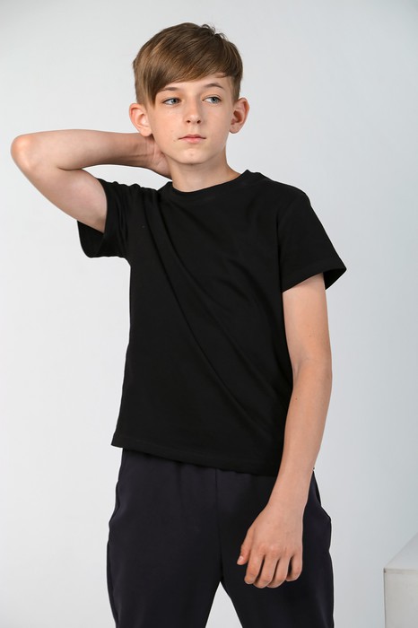 Базовая футболка для мальчика, из кулирки плотностью 160г/м2. Модель со слегка спущенной линией плеч и округлым вырезом горловины.