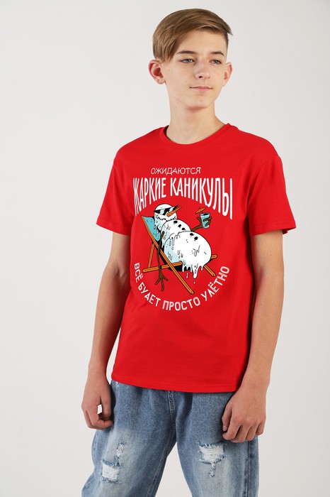 Футболка для мальчика классического покроя: с короткими втачными рукавами, горловиной овальной формы, обработанной втачной планкой, и принтом в центре переда, выполненным в технике шелкографии. По шву втачивания планки в горловину настрочена отделочная строчка на двухигольной машине. неижние срезы рукавов и изделия обработаны подгибкой.
