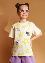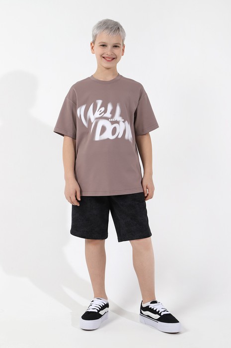 Футболка оверсайз для мальчика из трикотажного полотна: хлопкового с добавлением лайкры. Модель с принтом на переде, спущенной линией плеч, рукавами длиной до локтя.
