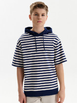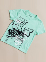 Футболка оверсайз для мальчика из трикотажного полотна: хлопкового с добавлением лайкры. Модель с принтом на переде, спущенной линией плеч, рукавами длиной до локтя.