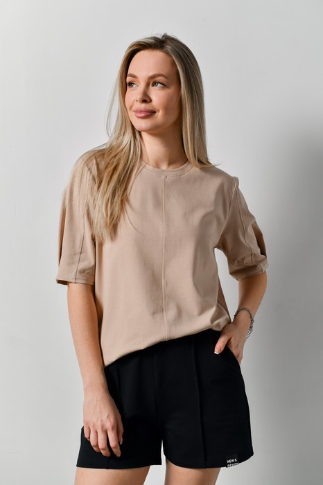 Футболка женская модной объемно-силуэтной формы, с вертикальным отстроченным швом по центру переда. На рукавах выполнены глубокие защипы по низу и также вертикальные отстроченные швы.