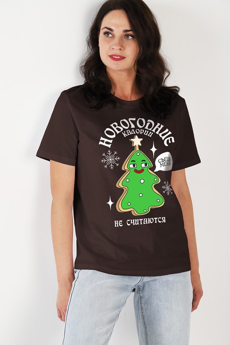 Футболка женская классического покроя: с короткими втачными рукавами, горловиной овальной формы, обработанной втачной планкой, и принтом в центре переда, выполненным в технике шелкографии. По шву втачивания планки в горловину настрочена отделочная строчка на двухигольной машине. неижние срезы рукавов и изделия обработаны подгибкой.