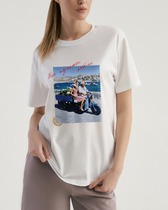 Футболка прямого свободного кроя, выполнена из хлопкового полотна. Характеристики: прямой свободный крой, горловина овальная, рукав слегка спущен, горловина и край рукава выполнены из довяза, по передней части изделия слева декоративная объемная печать "Annete". Длина по центру спинки 69 см, длина рукава 18 см.