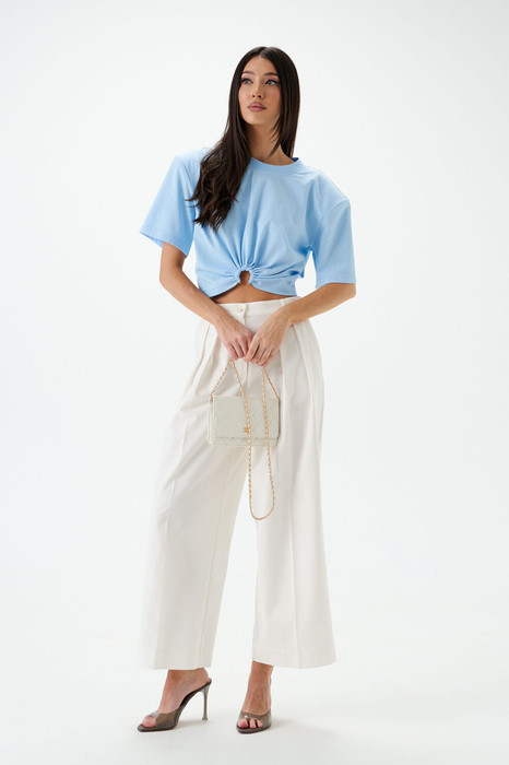 Футболка прямого кроя, выполнена из хлопкового полотная голубого цвета. Характеристика: укороченая, прямой свободный крой, горловина овальная, рукав слегка спущен, подплечники, спереди декоративная сборка на элемент-полукольцо . Длина по центру спинки от края горловины 40 см, длина рукава от края горловины 39 см.