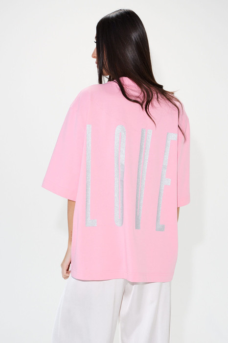 Футболка прямого кроя, выполнена из хлопкового полотная розового цвета. Характеристика: прямой свободный крой, горловина овальная, рукав слегка спущен, на спинке печать "LOVE" серебристого цвета. Длина по центру спинки от края горловины 75 см, длина рукава от края горловины 39 см.
