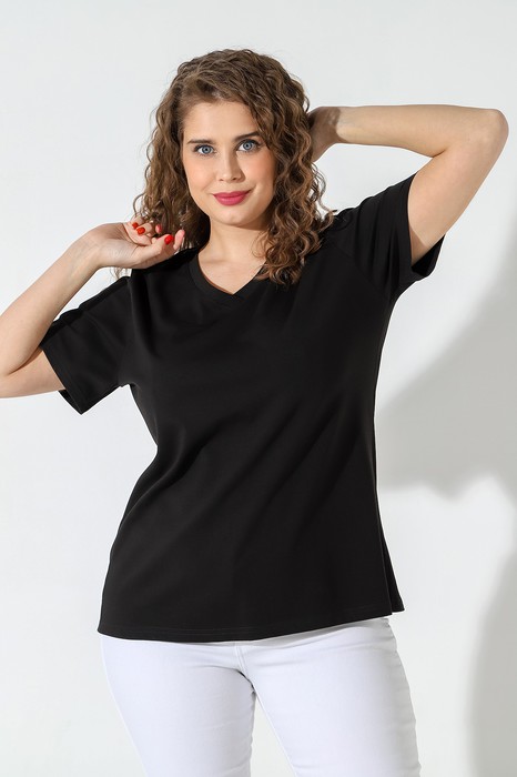 Футболка из гладкокрашеного трикотажного полотна «кулирка с лайкрой» классического покроя, с короткими втачными рукавами, горловиной V-образной формы, обработанной втачной планкой и принтом на полочке.