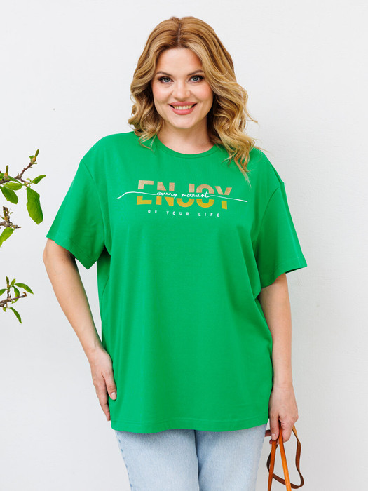 Базовая женская футболка. Крой футболки свободный, оверсайз.Вырез горловины круглый. Рукав до локтя. Линия плеча спущенная.Футболка выполнена из хлопкового трикотажного полотна.Трикотаж не просвечивается, не деформируется после стирки, легко гладится.По переду выполнена авторская печать в виде надписи “enjoy” переливающейся фольгой.Футболка универсальная, сочетается с любыми джинсами и шортами. Длина - 70 см