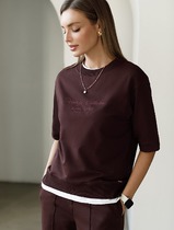 Футболка женская из гладкокрашенного трикотажного полотна «кулирка с лайкрой», свободного покроя, со спущенным плечом и втачными рукавами длиной до локтя, горловиной овальной формы, обработанной втачной планкой. По центру полочки выполнена вышивка «пайетками» в тон изделия. В нижней части боковых швов небольшие разрезы.