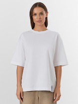 Футболка из гладкокрашеного трикотажного полотна «кулирка» с эффектом «варенки», свободного покроя, горловиной овальной формы, обработанной притачной планкой. Низ рукавов и изделия состоит из двух частей, одна из которых с необработанным краем, другая с подгибкой и соединенных между собой накладным швом.