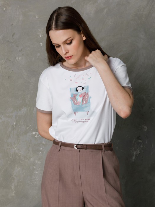 Модель прямого силуэта, со спущенным плечом. Низ рукава и вырез горловины окантованы.