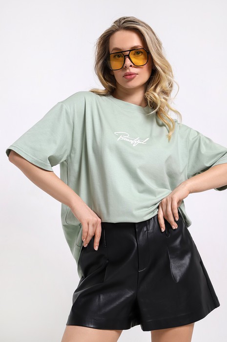 Футболка молодежная из гладкокрашенного полотна «кулирка» свободного покроя, со спущенной линией плеча, широкой подгибкой низа изделия и рукавов, горловиной овальной формы, обработанной втачной планкой, принтом на полочке, выполненным в технике «шелкографии».