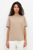 Джемпер женский из трикотажной хлопковой ткани (двунитка). По переду футболки расположен декоративный элемент из тесьмы. Спущенное плечо. Низ рукава, низ изделия и вырез горловины обработаны отделочной тесьмой. Спинка без среднего шва.