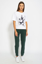 Джемпер из трикотажной хлопковой ткани, со спущенным плечом. По переду джемпера расположены декоративные элементы. Вырез горловины круглый, оформлен бейкой. Спинка без среднего шва.