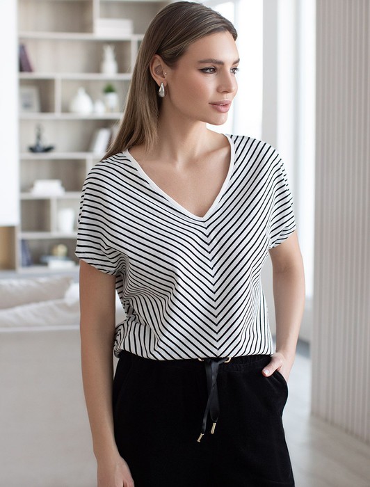 Состав: 92%Хлопок 8%ПУ Плотность: 170 Г/м2 Параметры модели на первом фото: Рост 170, бюст 89, талия 63, бедра 92Футболка выполнена из эластичного хлопка. Модель с цельнокроеным рукавом и V-вырезом, который подчеркивают геометрично соединенные полосы. В отличии от классической горизонтальной полоски, такой орнамент стройнит и вытягивает силуэт. Изделие дополнено металлическим логотипом бренда.