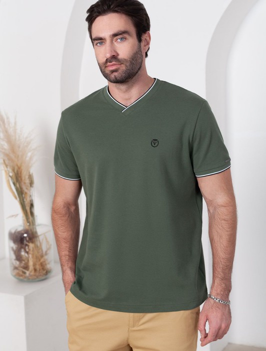 Состав: 95%Хлопок 5%ПУ Плотность: 170 Г/м2Футболка темно-оливкового цвета с аккуратным V-образным вырезом выполнена из премиального хлопка с эластаном плотностью 200 Г/м2. Высококачественный эластичный хлопок обеспечивает мягкость, воздухопроницаемость и идеальную посадку на любую фигуру и размеры, включая 58 размер. Классический прямой крой футболки подчеркивает фигуру, но не сковывает движений. Элегантный небольшой V-образный вырез с контрастной полосой визуально удлиняет шею, а минималистичная вышивка на груди в виде логотипа бренда добавляет изысканности и индивидуальности, не перегружая образ. Эта базовая футболка - идеальный баланс комфорта и стиля для современного мужчины, легко сочетается с разными низами, создавая образ от кэжуал до более элегантного. Стильная футболка подходит как для повседневной носки, так и для создания более нарядных образов.