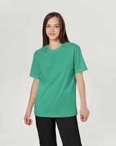 Футболка молодежная из гладкокрашенного полотна «кулирка с лайкрой», свободного покроя, со спущенной линией плеча, втачными рукавами длиной до локтя, горловиной овальной формы, обработанной втачной планкой. Изделие дополнено декоративной нашивкой, в боковых швах выполнены разрезы.