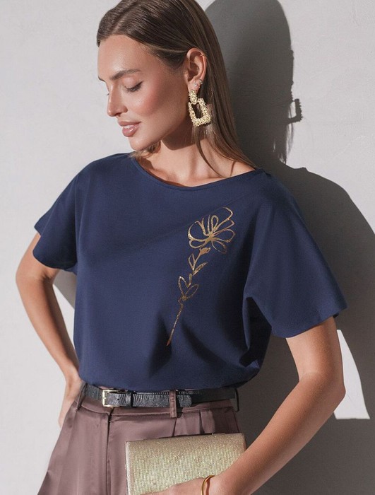 Футболка черного цвета идеально подходит для вечеринки и создания яркого образа. Оригинальный блестящий принт из фольги в виде цветка придает изделию шикарный вид, который привлечет внимание на любом мероприятии. Модель с вырезом лодочка и цельнокроеным рукавом обеспечивает свободу движений и комфорт в носке. Такой фасон изделия подходит на большие размеры, гармонично сидит на фигуре и помогает создать легкий акцент на достоинствах. Благодаря особенностям кроя с цельнокроеным рукавом удается искусно скроет любые возможные недостатки в области плеч и рук, обеспечивая комфортное прилегание без ощущения скованности. Аккуратный вырез лодочка красиво подчеркивает шею и делает образ элегантным, сохраняя актуальность для разных случаев — от рабочих встреч до вечерних прогулок и праздничных мероприятий.