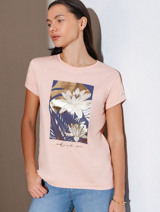 Модная футболка пудрового цвета привлекает внимание своим интересным дизайном и ярким принтом. Благодаря прямому крою изделие комфортно садится на любую фигуру, в том числе на большие размеры, и не сковывает движений. Круглый вырез подчеркивает современный стиль, а натуральный материал из хлопка с добавлением эластана обеспечивает удобство в повседневной носке и приятные тактильные ощущения. Прочность и износостойкая структура сохраняет первоначальную форму футболки после множества стирок. Рукава имеют аккуратные подгибы, что придает изделию завершенность и помогает сохранять аккуратный внешний вид. Принт в виде цветов и надписи нанесен красками с устойчивым покрытием, перевод надписи: Handle with care - Обращаться с осторожностью. Стильная футболка гармонично вписывается в любой гардероб и подойдет для прогулок, отдыха дома или неформальных встреч. Благодаря особенностям кроя модель хорошо сидит, скрывая недостатки и подчеркивая достоинства. Удобная футболка идеально сочетается с базовыми вещами, позволяя