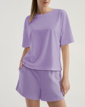 Футболка женская из гладкокрашенного трикотажного полотна «кулирка», свободного силуэта, с боковыми швами, переходящими в рельефы, в правом соединительном шве выполнен разрез. Горловина овальной формы обработана втачной планкой и дополнена декоративным элементом.