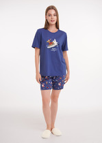 Халат женский из гладкокрашенного трикотажно полотна «кулирка» с набивным рисунком, полуприталенного силуэта, с короткими рукавами покроя «реглан» и горловиной овальной формы, окантованной основным материалом, с центральной бортовой застежкой на тесьму «молния». По срезу горловины выполнены неглубокие складки, нижние резы рукавов обработаны притачными манжетами с кантом контрастного цвета.