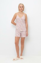 Халат женский из трикотажного полотна «кулирка» с набивным рисунком полуприлегающего силуэта, с горловиной овальной формы, окантованной основным материалом, короткими втачными рукавами с притачными манжетами. В боковых швах, смещенных в сторону полочки, обработаны карманы.