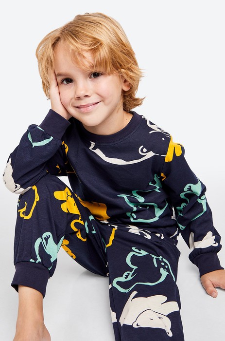 Джемпер прямого кроя и брюки с манжетами делают хлопковую пижамку практичной и удобной. Детская пижама с принтом подойдёт для сна и домашнего отдыха, создавая комфорт и радость для ребенка.