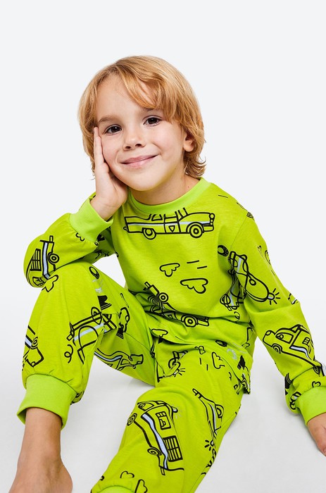 Очаровательная пижама для мальчика в ярком салатовом цвете с принтом Машины сделает домашние вечера ещё уютнее. Хлопковая трикотажная ткань мягкая и приятная, а забавный рисунок добавляет настроения на каждый день.